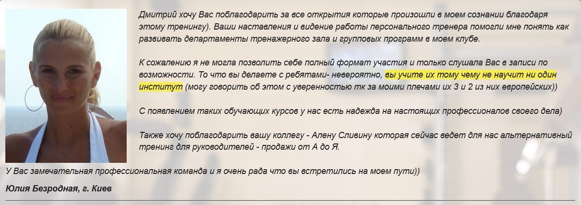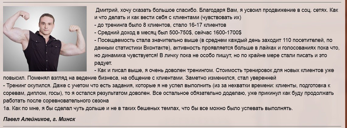 Алексей Никитин, г. Брянск (сейчас работает по контракту в Омане): "настало время, когда все свободные часы заняты персоналками, люди просятся на тренировки, а я отказываю, ставлю в очередь. И это в "мертвый сезон" летом! Если бы у Вас не обучался, всего этого бы не было"