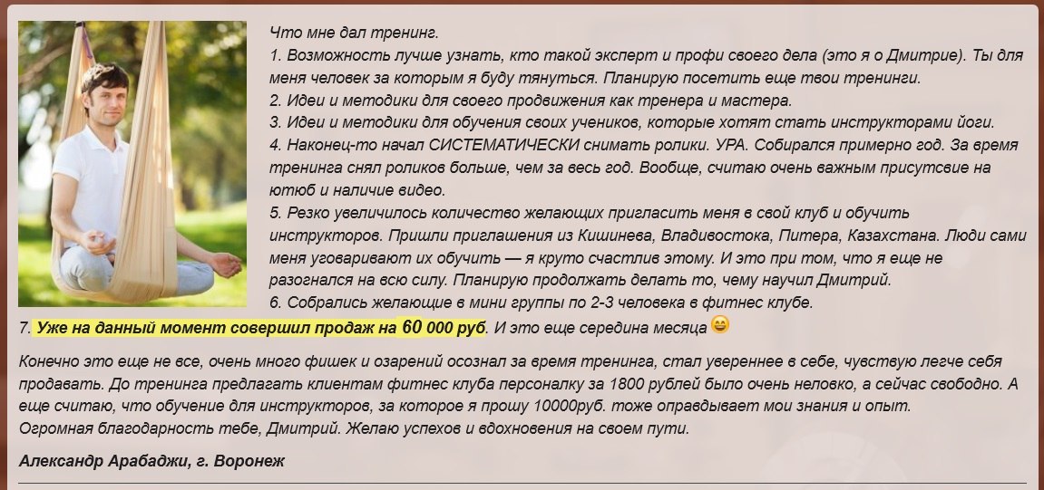 Александр, начинающий тренер: прочитал несколько моих статей и прослушал бесплатный вебинар по продажам для тренеров, и