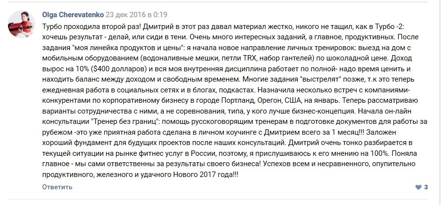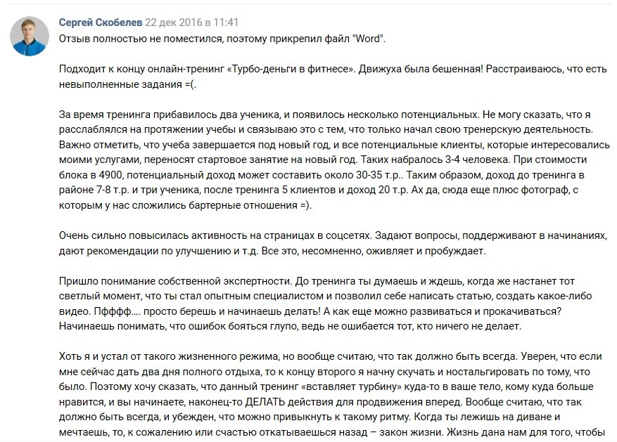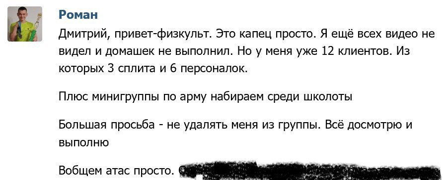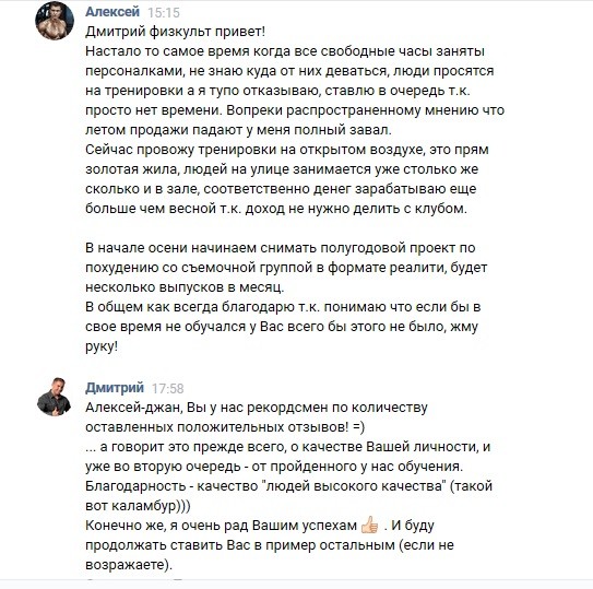 Алексей Никитин, г. Брянск (сейчас работает по контракту в Омане): "настало время, когда все свободные часы заняты персоналками, люди просятся на тренировки, а я отказываю, ставлю в очередь. И это в "мертвый сезон" летом! Если бы у Вас не обучался, всего этого бы не было"