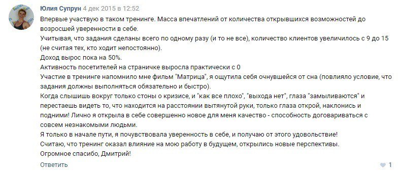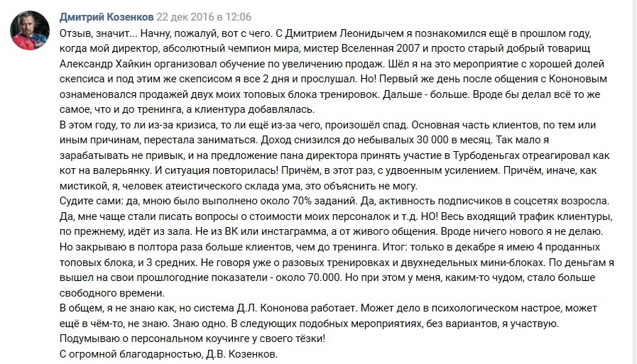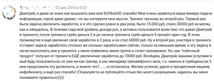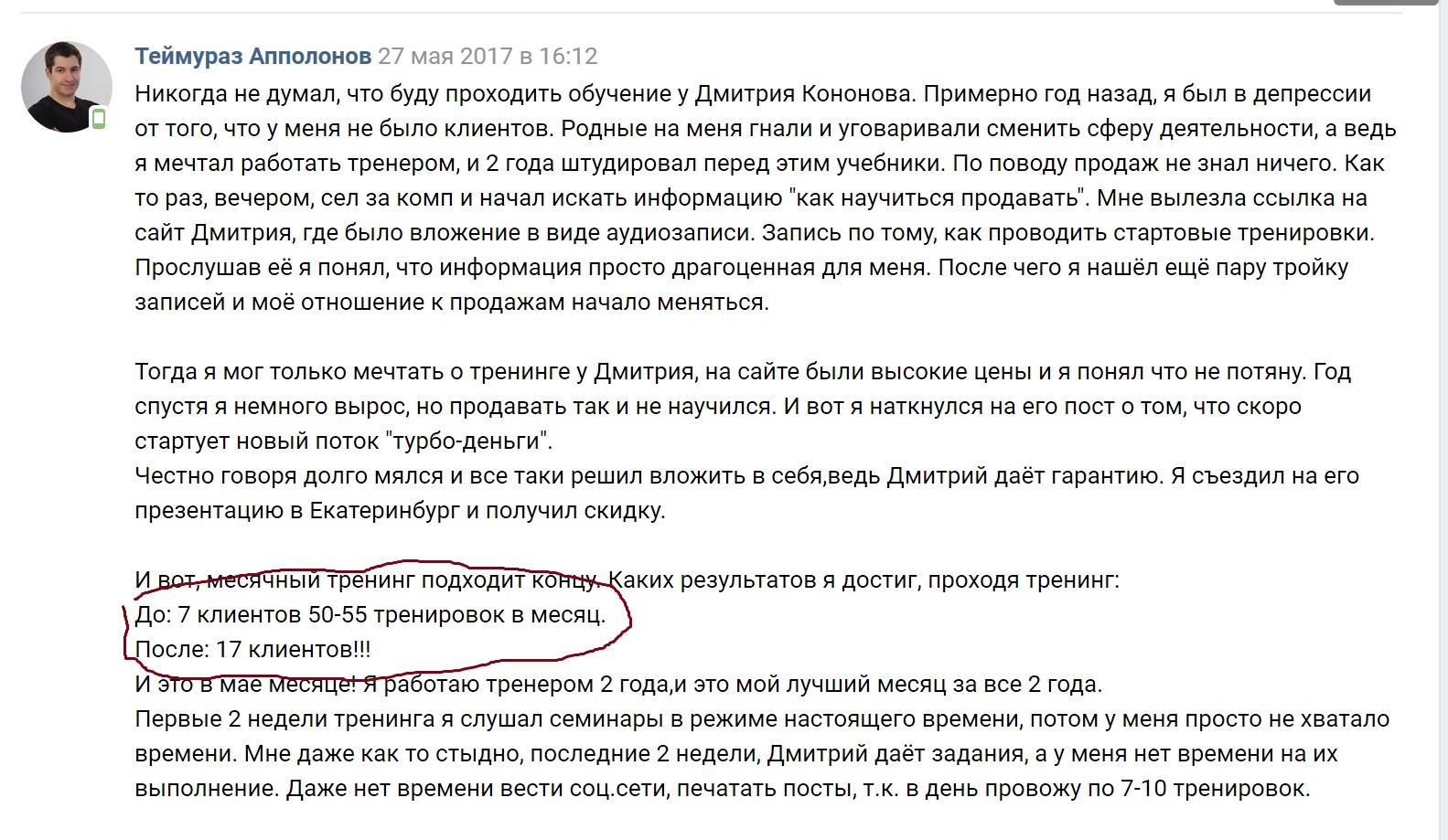 Тренер N, г. N (просил не публиковать личных данных): проходил тренинг дважды, увеличил свой доход с 15 000 р. до 70 000 р, получил повышение до менеджера ТЗ