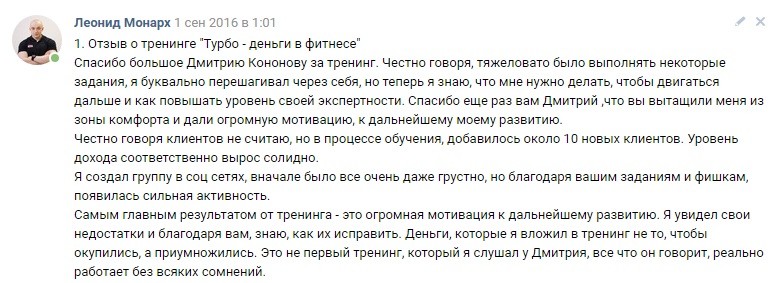 Леонид Монарх, г. Киров: в процессе обучения добавилось около 10 новых клиентов, солидно вырос доход. Вложенные деньги не просто окупились, а приумножились!