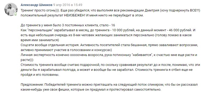 Александр Шмаков, г. Нижний Тагил: до тренинга было 3 постоянных клиента, после тренинга - 16. Продажи персональных тренировок по единоборствам до тренинга = 10 000 р, после тренинга = 46 000 р. Рост продаж персоналок в 4 раза.