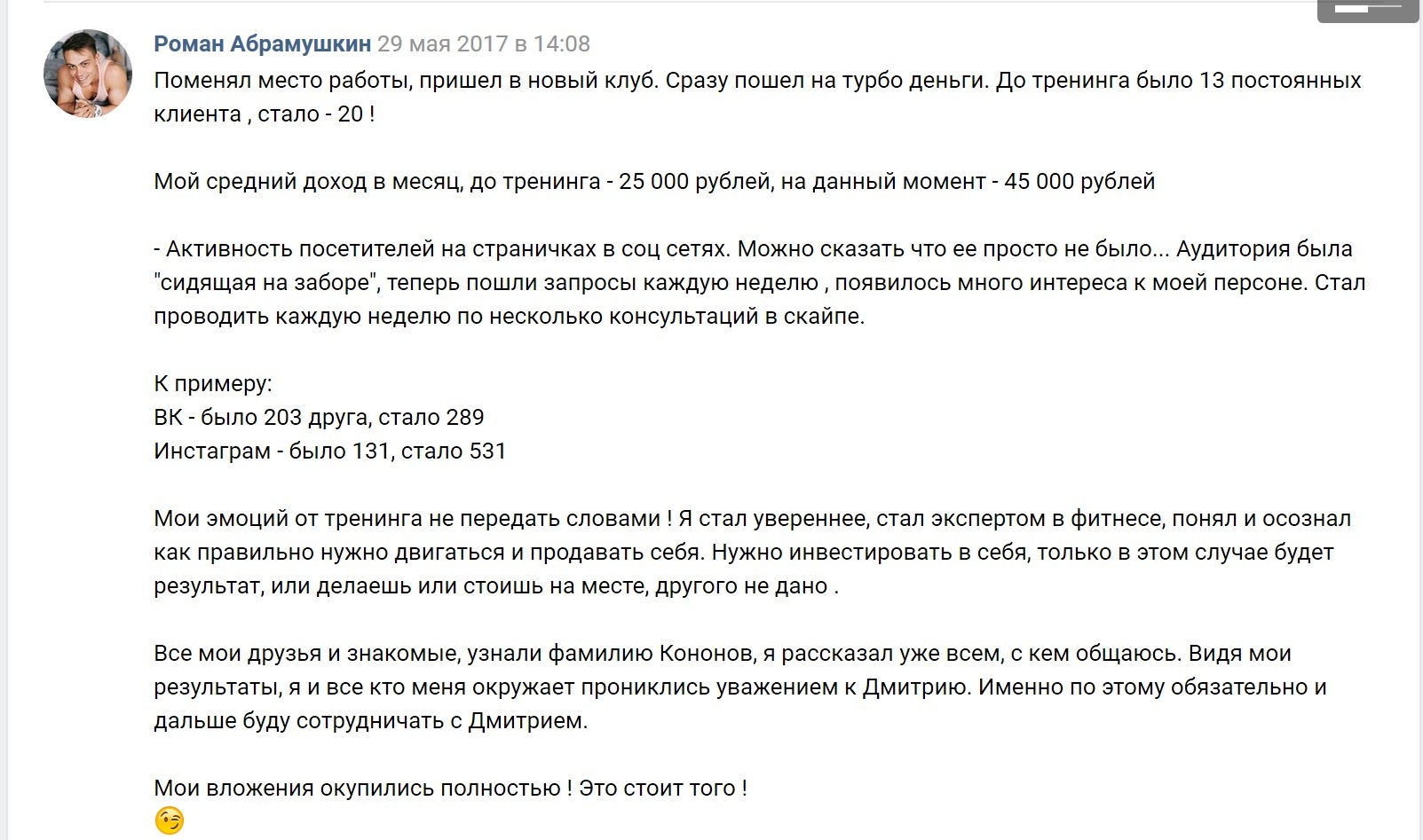Роман Абрамушкин, г. Екатеринбург : увеличил доход с 25 000 до 45 000 р. за месяц. В 4 раза увеличилось количество подписчиков в Инстаграм. Начал проводить фитнес-консультации в скайпе