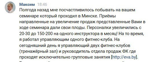 Максим Андреевич, г. Минск: после пройденного семинара Дмитрия Кононова по продажам, количество персоналок на одного инструктора выросло с 20-30 до 150 - 200 в месяц