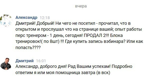 Александр, начинающий тренер: прочитал несколько моих статей и прослушал бесплатный вебинар по продажам для тренеров, и